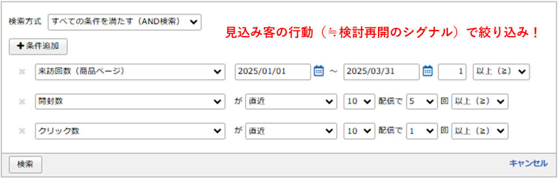 たとえば、「Webサイトの資料請求ページに今月来訪したお客様」や、「直近10回のメール配信で2回以上URLをクリックしたお客様」といった絞り込みが可能です。