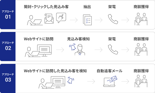 たとえば、メールを複数回クリックしている人や料金ページを訪れている人は関心度が高いと判断でき、優先的にアプローチすることで商談化の確度を高めることが可能です。