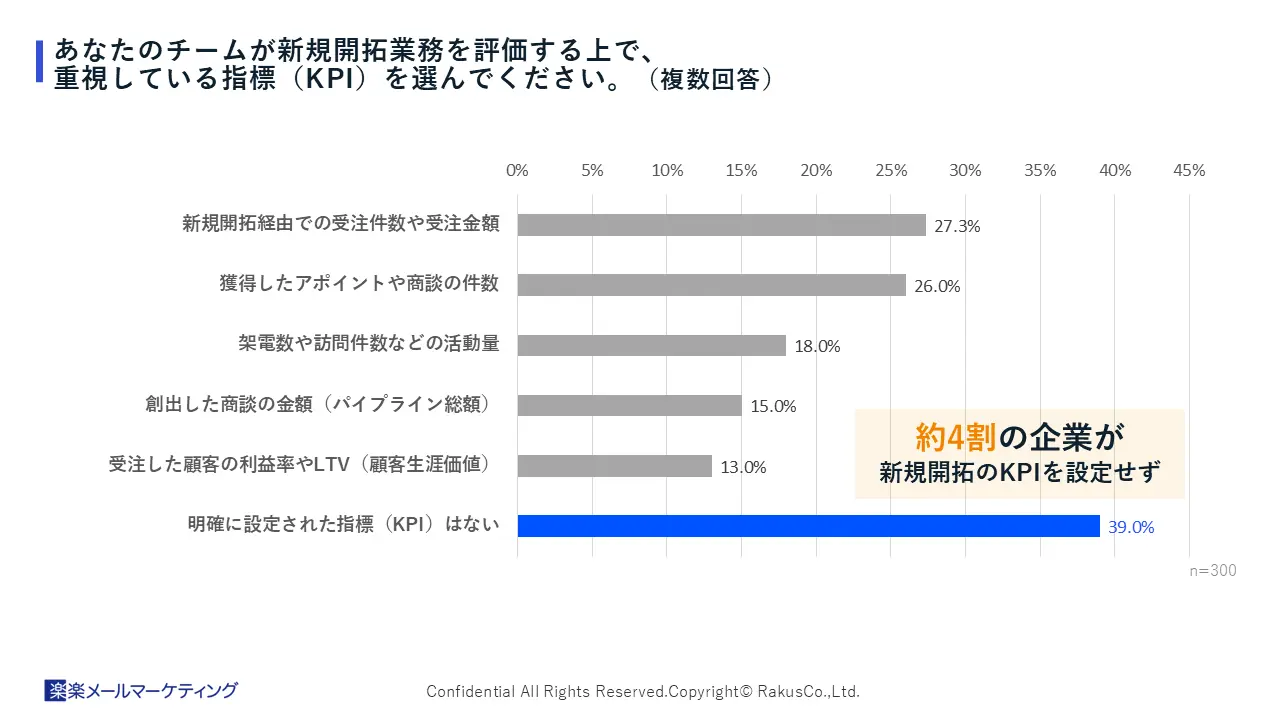 新規開拓業務を評価する指標(KPI)について、全体では39.0%が「明確に設定された指標(KPI)はない」と回答しました。成果に繋がる活動を定量的に判断する基準を持たずに、日々の営業が行われているケースが少なくないようです。