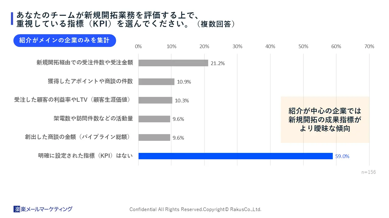 また新規開拓を「紹介」に頼る企業では、「明確に設定された指標(KPI)はない」と回答した割合が59.0%にまで上昇。「紹介」という受動的な手法への依存が、営業活動を管理・評価する仕組みの導入を遅らせる一因となっている可能性が考えられます。
