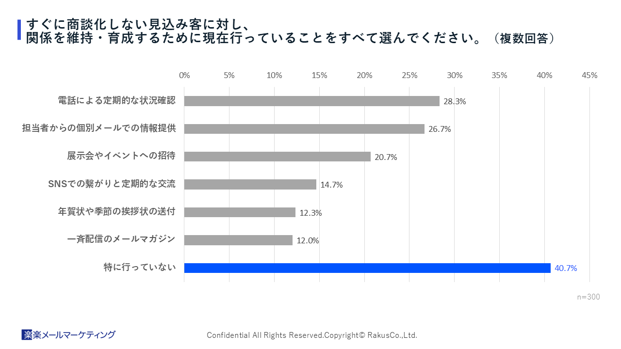 その一方で、すぐに商談化しない見込み客に対する継続的なアプローチについて、40.7%が「特に行っていない」と回答。